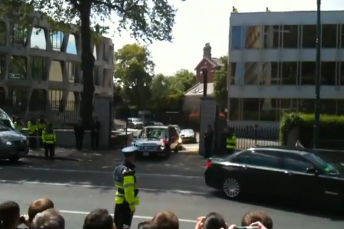 US President Barack Obama’s indestructible limo, nicknamed ‘The Beast’, got stuck leaving the US Embassy in Dublin earlier today. An exit ramp trapped the vehicle in which Barack Obama and the first lady Michelle Obama were traveling in following lunch with US Ambassador Dan Rooney.