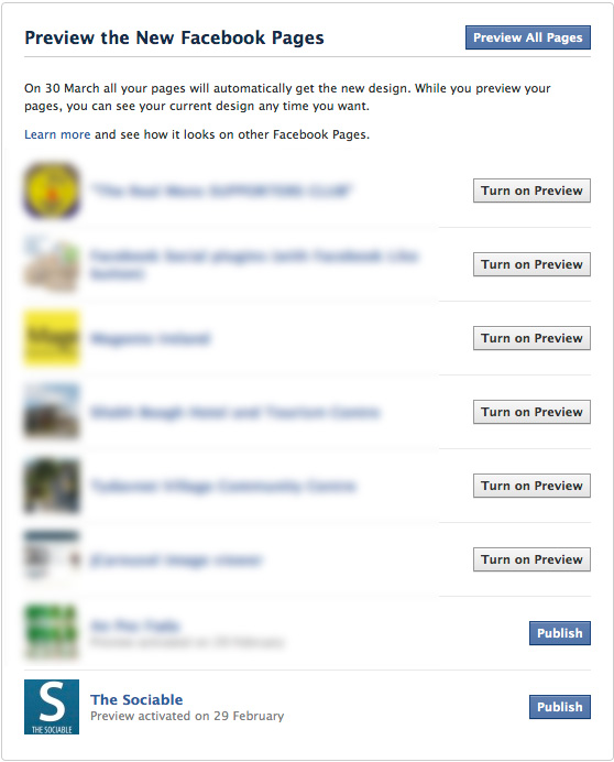 Want to try Facebook Timeline for Pages right now? To preview Timeline for Pages visit this link. From here you can ‘Turn on Preview’ on select Facebook Pages or ‘Preview All Pages’ if, like me, you administer more than one.