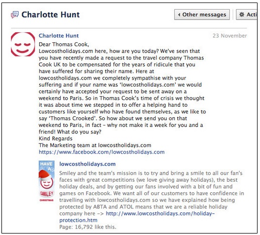He was quickly and coldly rebuffed. This is where lowcostholidays.com stepped in. Their company gained some valuable PR and Thomas Cook was left looking silly, appearing ignorant to how social media works.