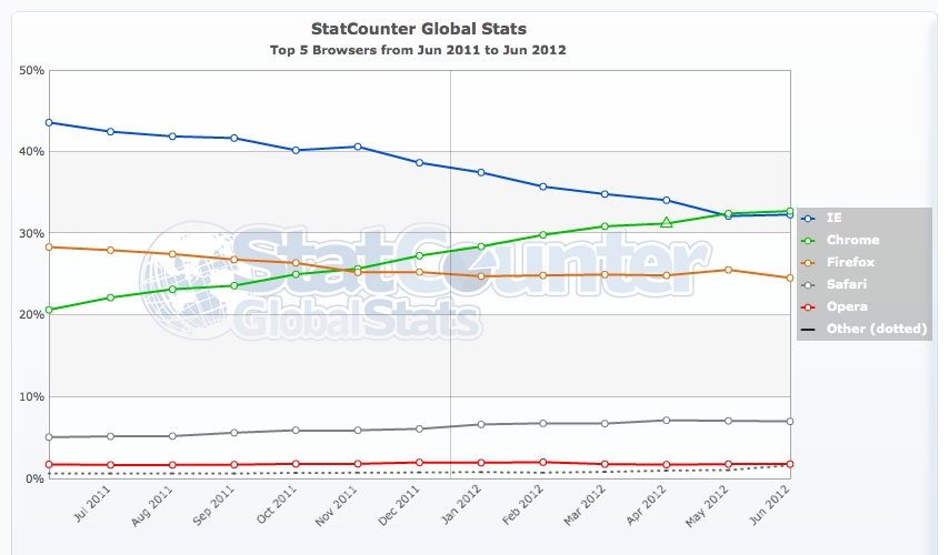 Chrome first eclipsed Internet Explorer worldwide by the narrowest of margins at the end of May, and has again gained a further, but slight, advantage during the month of June. Chrome’s share stands at 32.8% as of the end of June, while Internet Explorer holds on to its 32.3% share.