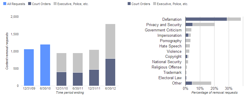 Google’s Transparency Report is a massive document – this interactive site outlines the amount and types of data that governments, justice agencies (courts, police etc), and private companies request Google for access to or removal of.  It also outlines the number of requests private companies made to Google in order to have data removed from its servers.